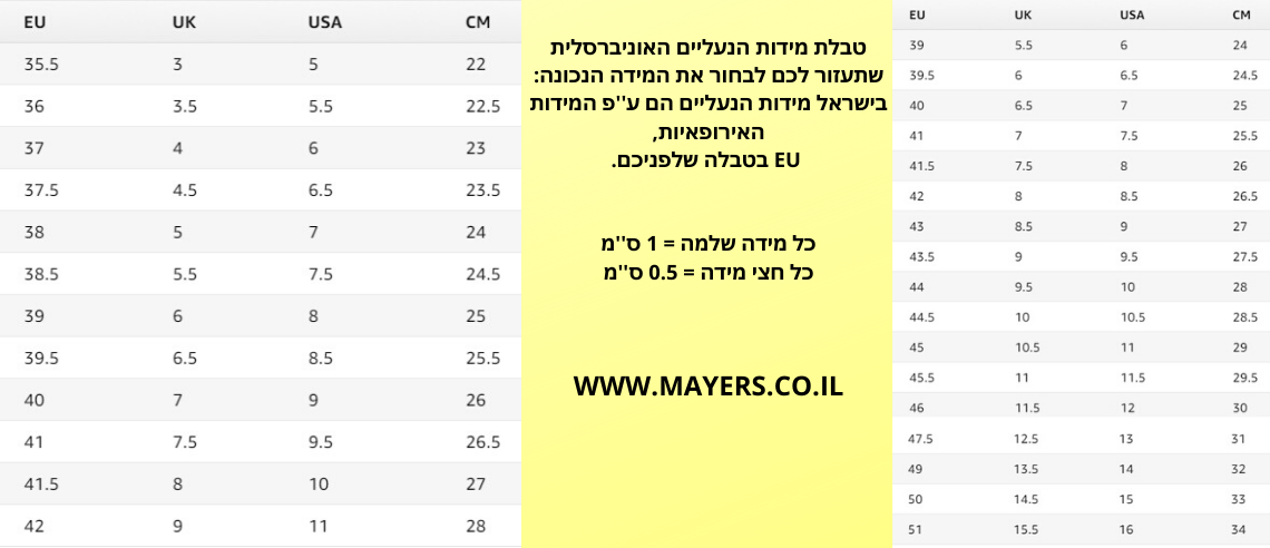 צירפנו לכם טבלאות מידה שתוכלו להשוות לנעליים שיש לכם בבית או למדוד את אורך כף הרגל.